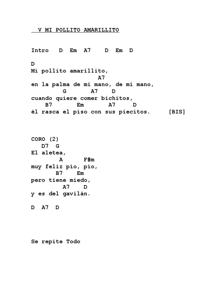 Pollito Amarillito Acordes - D mi pollito amarillito, a7 en la palma de mi mano, de mi mano, g a7 d cuando quiere comer bichitos, b7 em a7 d él rasca el.