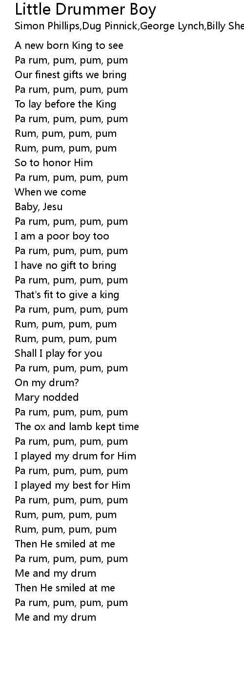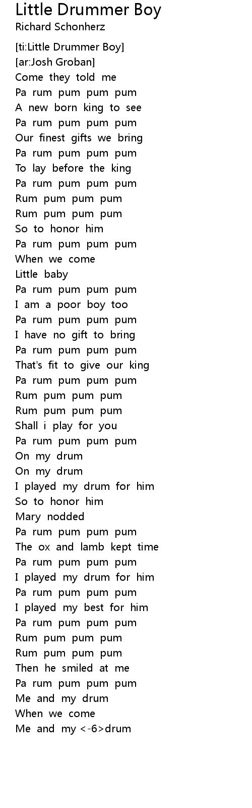 The Little Drummer Boy Lyrics / Come they told me pa rum pum pum pum a new born king to see, pa rum pum pum pum our finest gifts we bring pa rum.